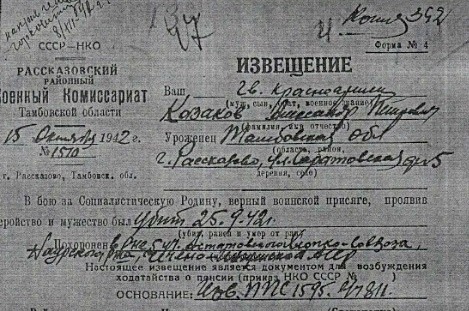Один из них — Казаков Александр Петрович, 1902 года рождения. Уроженец города Рассказово, призывался Рассказовским РВК, служил в составе 4-й гвардейской стрелковой бригады, убит 25 сентября 1942 года.