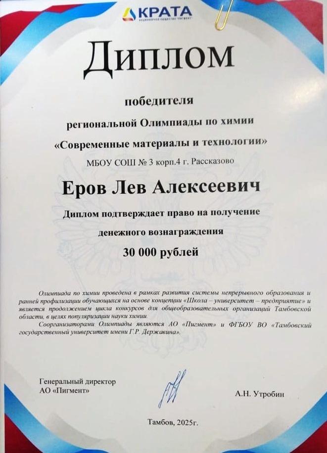 Державинский университет и АО «Пигмент» провели олимпиаду по химии среди школьников 10-11 классов «Современные материалы и технологии». Олимпиада проходила в два этапа. На заочном конкурсанты выполняли тесты. Это были задания из курса общей химии, которые составлялись совместно преподавателями университета и компетентными сотрудниками тамбовского предприятия. Тех, кто набрал более 50% правильных ответов, пригласили во второй тур. В число счастливчиков попал и рассказовский десятиклассник.