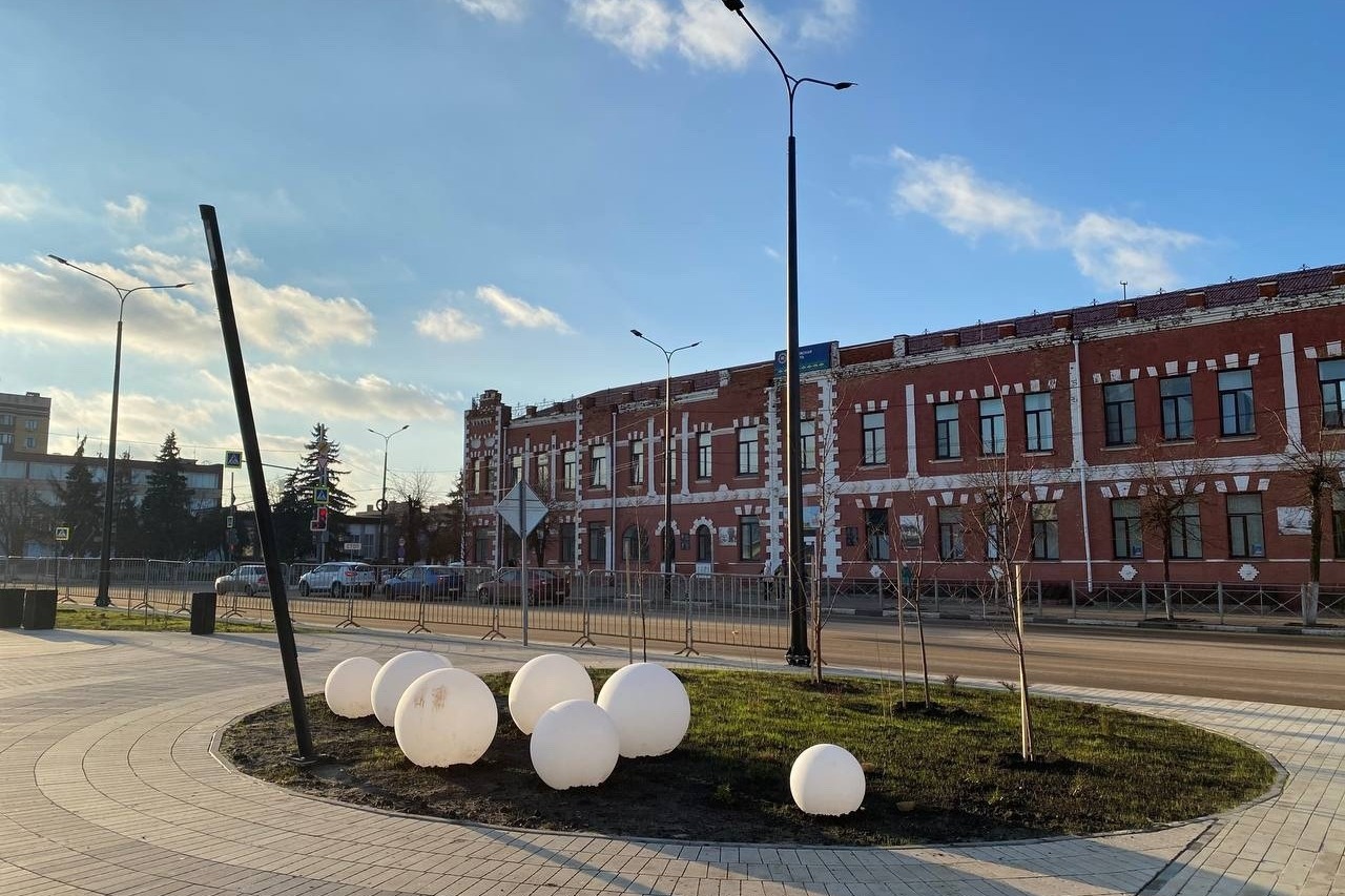 На светлой современной плитке подрядчик установил белые и красные декоративные шары, в сквере — перголу для отдыха, удобные велопарковки и урны.