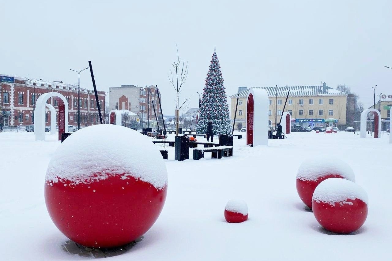 На светлой современной плитке подрядчик установил белые и красные декоративные шары и необычный арт-объект — глобус. На арках разместили информацию о развитии города с 1926 года по наше время.