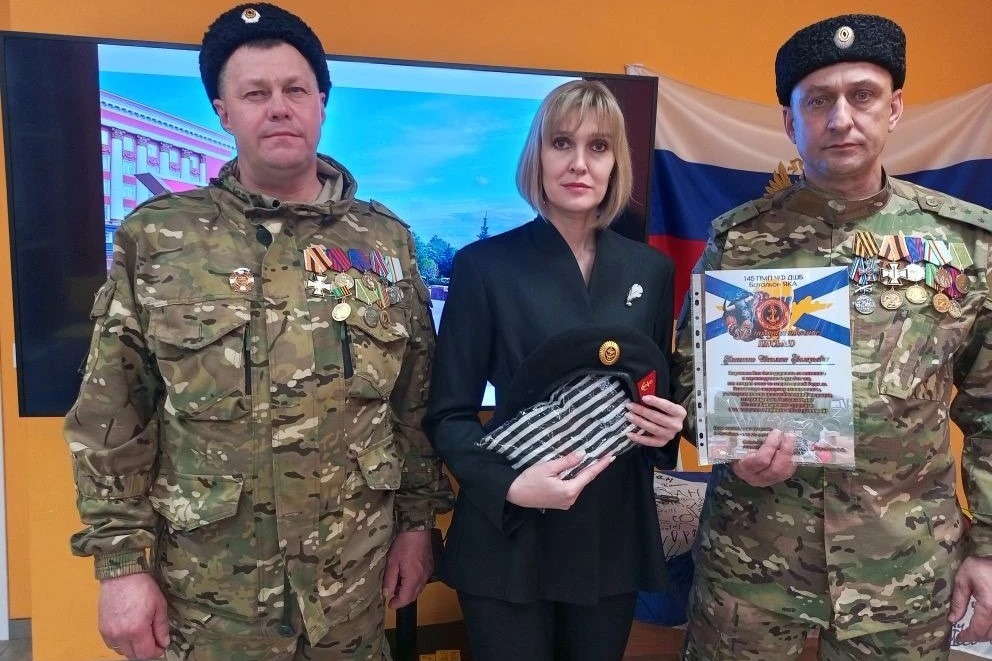 Вниманию участников мероприятия представили видеофрагменты о событиях весны 2025 года, в том числе об уникальной операции «Поток» и освобождении города Горналь. Валерий Коротеев передал директору музея Светлане Плашенко символ морских пехотинцев — чёрный берет и тельняшку.